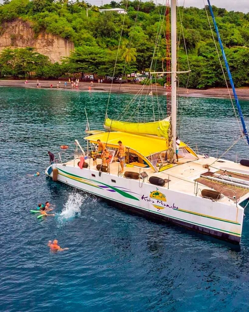 Retour à bord du bateau pour un mouillage le long de la plage du Carbet. Pause baignade pour ceux qui le souhaitent. Déjeuner créole qui sera préparé et servi à bord du catamaran par notre cook.